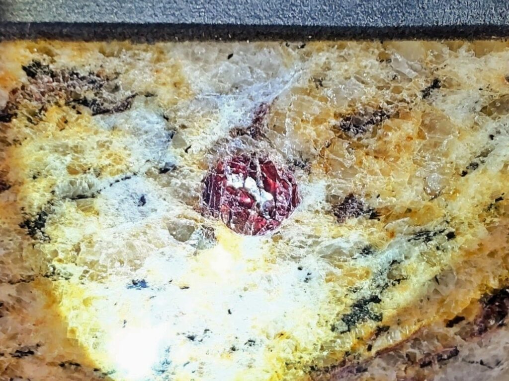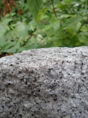 集合場所のすぐそば、KITTEの外壁には、赤くきらめくガーネット粒を含む花崗岩。